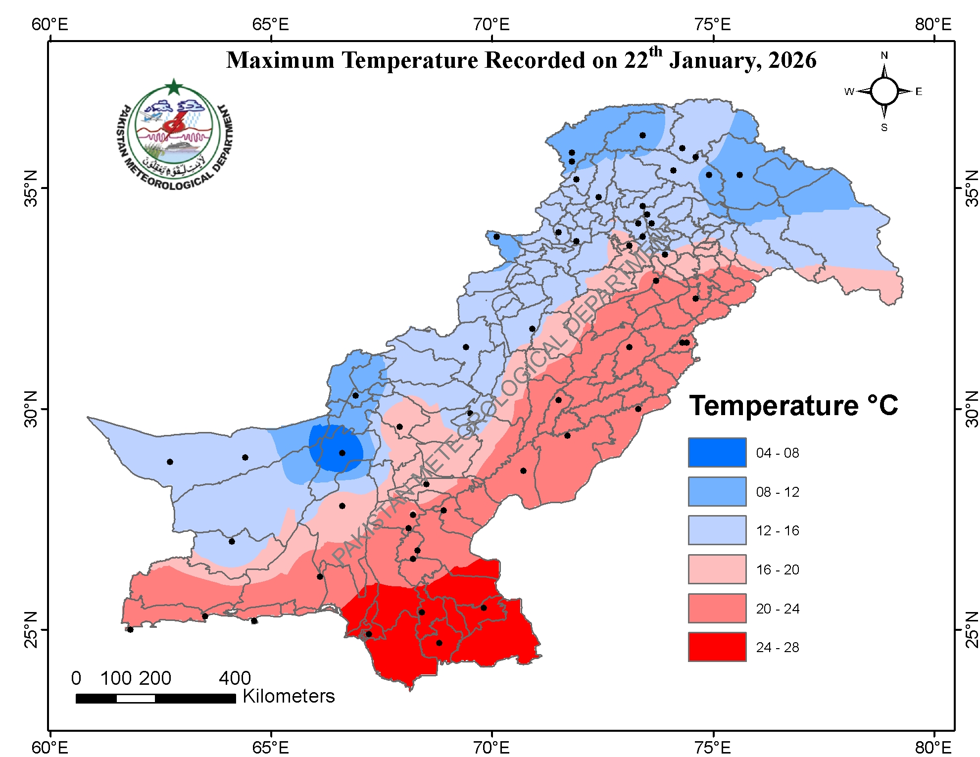 Rainfall (mm):Khyber Pakhtunkhwa: Parachinar 88, Bannu 14, Di Khan City & Di Khan Airport 13, Peshawar City & Bacha Khan Airport 09, Chitral & Drosh 08, Mir Khani, Peshawar Airport & Cherat 07, Kalam 06, Takht Bai 03, Dir & Pattan 02, Lower Dir 01, Balochistan: Khuzdar 12, Zhob 10, Samungli 09, Ormara 08, Sibbi 06, Quetta & Lasbella 03, Panjgur 01, Punjab: Karor (layyah) 10, Bhakkar 09, D G Khan 06, Kot Addu 04, Sargodha City 01, Sindh: Jacobabad & Sukkur 10, Khairpur 04, Rohri, Dadu, Mohenjo Daro & Thatta 03, Padidan 02, Sakrand & Nawabshah 01.Snowfall (inches): Kalam, Quetta (city) and Parachinar 02.